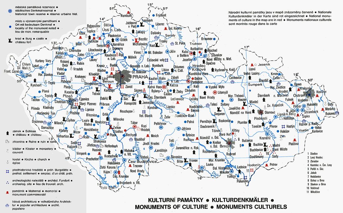 Repubblica ceca mappa monumenti. Repubblica ceca monumenti mappa (Europa dell'Est - Europa) per la stampa. Repubblica ceca monumenti mappa (Europa dell'Est - Europa) per scaricare. In alto sopra la città vecchia di Brno si trova la bellissima Cattedrale di San Pietro e Paolo, uno dei monumenti nazionali più importanti della Repubblica Ceca. Il sito della cattedrale ospitava inizialmente una cappella romanica dell'XI secolo che fu poi ampliata per includere una cripta e una basilica, i cui resti sono ancora visibili. Il castello di Cesky Krumlov, il più importante monumento della Repubblica Ceca, è straordinariamente ben conservato data la sua età e domina la città vecchia da cui prende il nome, risalente al XIII secolo. Il Castello di Karlstejn, come mostrato nella mappa dei monumenti della Repubblica Ceca, è stato costruito tra il 1348 e il 1365 per Carlo IV, che era sia il re ceco che l'imperatore del Sacro Romano Impero. L'enorme castello neogotico bianco di Hluboka monumenti della Repubblica Ceca è spesso detto essere il più bello dei molti castelli della Repubblica Ceca se si prende un breve viaggio in auto a nord della città di Ceske Budejovice